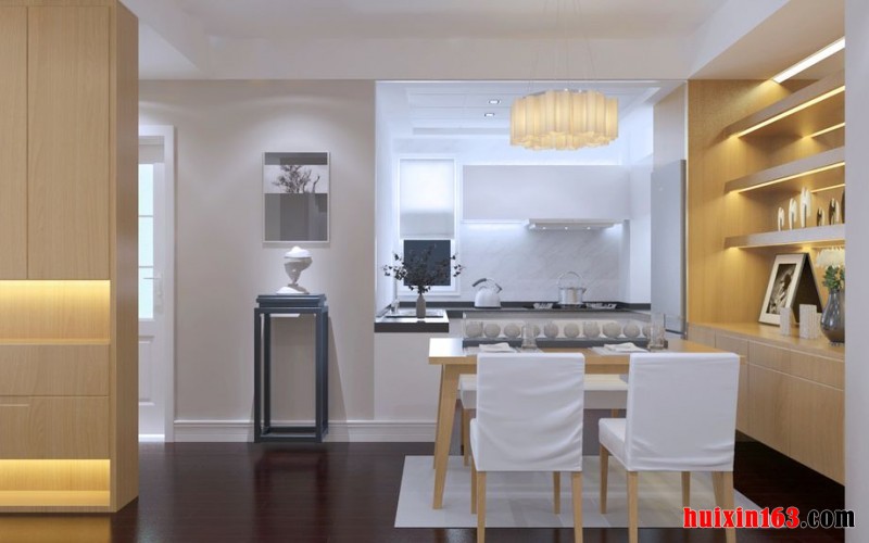 设计中整体牛奶白色空间布局,使空气里弥漫着纯洁素然的气息,棱角分明的家具配置让线条勾勒更加自然流畅,设计师非常恰当的抓住了空间特点和户型优势的结合,让现代与简约的细节彰显和和谐统一的气质。总体设计干净自然、优雅别致。餐厅和客厅的通透设计,让空间显得更加大气和自然,墙面处顶棚的一体化设计,而且保持一致的色调处理,配枣红色的地面处理形成对比之势,显得层次鲜明,餐桌椅的造型简洁流畅,方方正正的造型和空间的棱角形成相互照应该之势。大部分的墙面没有做过多的装饰,保持素色的纯洁特点,彰显了现代与简约的设计主题。