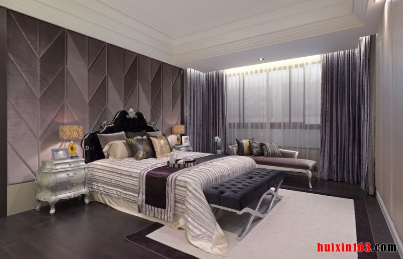 此套设计看上去十分大气,给人一种优雅别致、淡然如故的舒适之美。案例所示是富锦佳苑小区一套102平米二居室欧式风格装修效果图,装修预算约为13万元,工程类型为半包。该案例的亮点在于客厅的地面处理采用紫色的总体布局,可谓十分大胆,构思巧妙。紫色在中国传统色彩概念理解当中,带有浓重的宗教色彩,象征高雅的时尚内涵。设计师把整块的紫色运用在客厅的地面上,当然不是一时心血来潮,而是精心考虑到了沙发背景墙的设计规划,以及沙发组件的色调选择等多方面的因素,如果不那么费劲巴拉的去分析专业要点,仅从视觉色彩因素去看,地面的紫色和沙发背景墙的棕色形成对应之势,沙发的折色和顶棚的石膏板白色形成上下呼应之势。总体相互映衬、相得益彰。