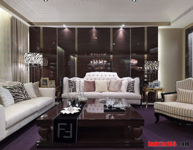 此套设计看上去十分大气,给人一种优雅别致、淡然如故的舒适之美。案例所示是富锦佳苑小区一套102平米二居室欧式风格装修效果图,装修预算约为13万元,工程类型为半包。该案例的亮点在于客厅的地面处理采用紫色的总体布局,可谓十分大胆,构思巧妙。紫色在中国传统色彩概念理解当中,带有浓重的宗教色彩,象征高雅的时尚内涵。设计师把整块的紫色运用在客厅的地面上,当然不是一时心血来潮,而是精心考虑到了沙发背景墙的设计规划,以及沙发组件的色调选择等多方面的因素,如果不那么费劲巴拉的去分析专业要点,仅从视觉色彩因素去看,地面的紫色和沙发背景墙的棕色形成对应之势,沙发的折色和顶棚的石膏板白色形成上下呼应之势。总体相互映衬、相得益彰。